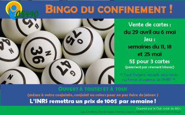 À la demande générale, l'INRS et le club social 490 sont heureux de vous annoncer le lancement du bingo du confinement !!