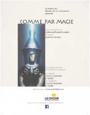Le Chœur du Musée plonge dans l’univers envoûtant et mystique de l’exposition Égypte magique, qui se tient au Musée de la civilisation jusqu’au 10 avril 2016. Le répertoire évoque les pouvoirs surnaturels que les anciens Égyptiens obtenaient de leurs dieux pour les aider à vivre leur quotidien et agir sur leur destin.