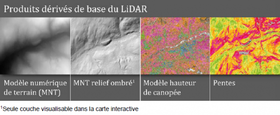La Direction des inventaires forestiers est heureuse d’annoncer la diffusion gratuite pour tous des quatre produits dérivés de base du LiDAR présentés ci-dessous (voir image).
