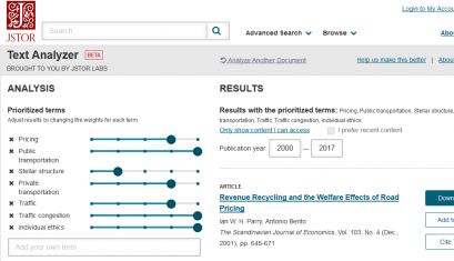 La plate-forme d'archives de revues JSTOR vient d’accoucher d’un outil au potentiel fort intéressant. À tester et à éventuellement ajouter à votre trousse à outils. Cela peut devenir un atout significatif dans la fabrication de la fameuse "boule de neige bibliographique"... Tout dépend en fait de la cooncordans ce votre domaine d'étude avec les contenus de JSTOR.