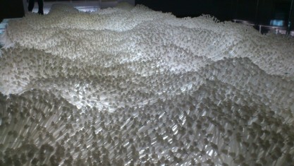 Sculptures en tierap toutes en dentelle, qui font la vague ou la coquette, et qui vous ont des allures de mousses forestières après le gel, montées dans un environnement tout en lumière. Et au fond, des dessins moléculaires, ou plutôt cristallins, qui rappellent des flocons de neiges.
