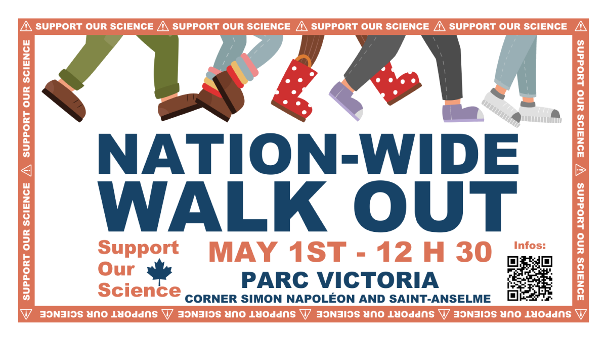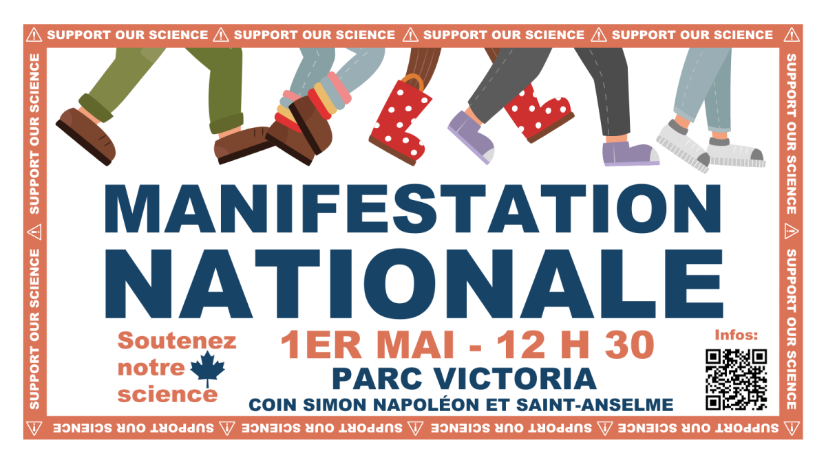 Les étudiant.e.s du centre Eau Terre Environnement vous invitent à se joindre à eux ainsi qu’aux étudiant.e.s des cycles supérieurs de l’Université Laval à la marche « Soutenez notre science » lundi 1er mai prochain au parc Victoria, au coin de l'avenue Simon Napoléon Parent et de la rue Saint-Anselme.