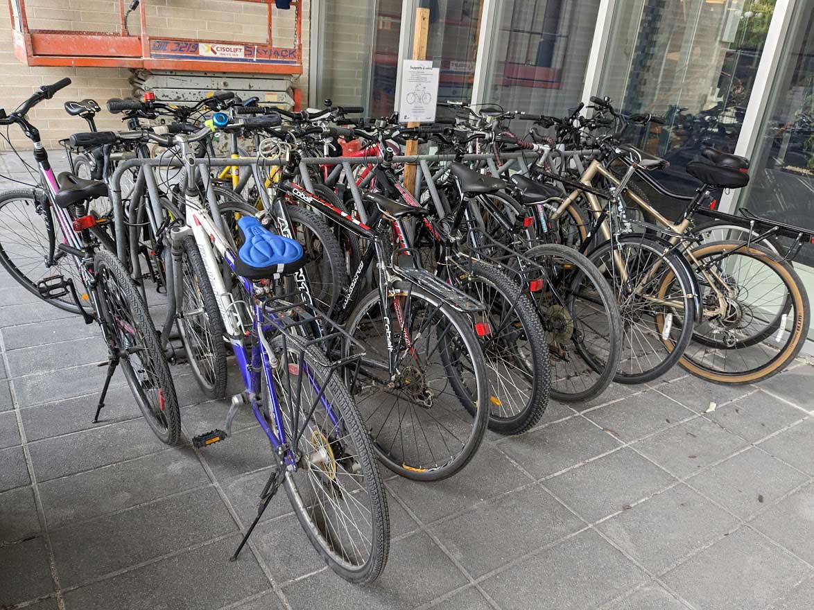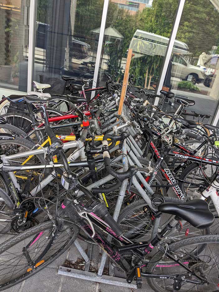 Aujourd'hui 12 juin, la quantité de vélos qui se cherchent une place sur le seul et unique support a atteint un paroxysme: 16 vélos sur un support conçus pour 8 ou 10. Cela exige patience et doigté quand vient le temps de sortir son vélo de l'enchevêtrement de cables, freins, pédales et autres résistances...