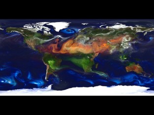 GEOS-5 (Goddard Earth Observation System Model, version 5) est un puissant logiciel de modélisation qui tourne sur un super-ordinateur quelque part au Maryland. Il sert entre autres à modéliser la présence d'aérosols, c'est à dire des particules solides ou liquides en suspension dans l'atmosphère de notre planète. Chaque couleur représente un aérosol différent :