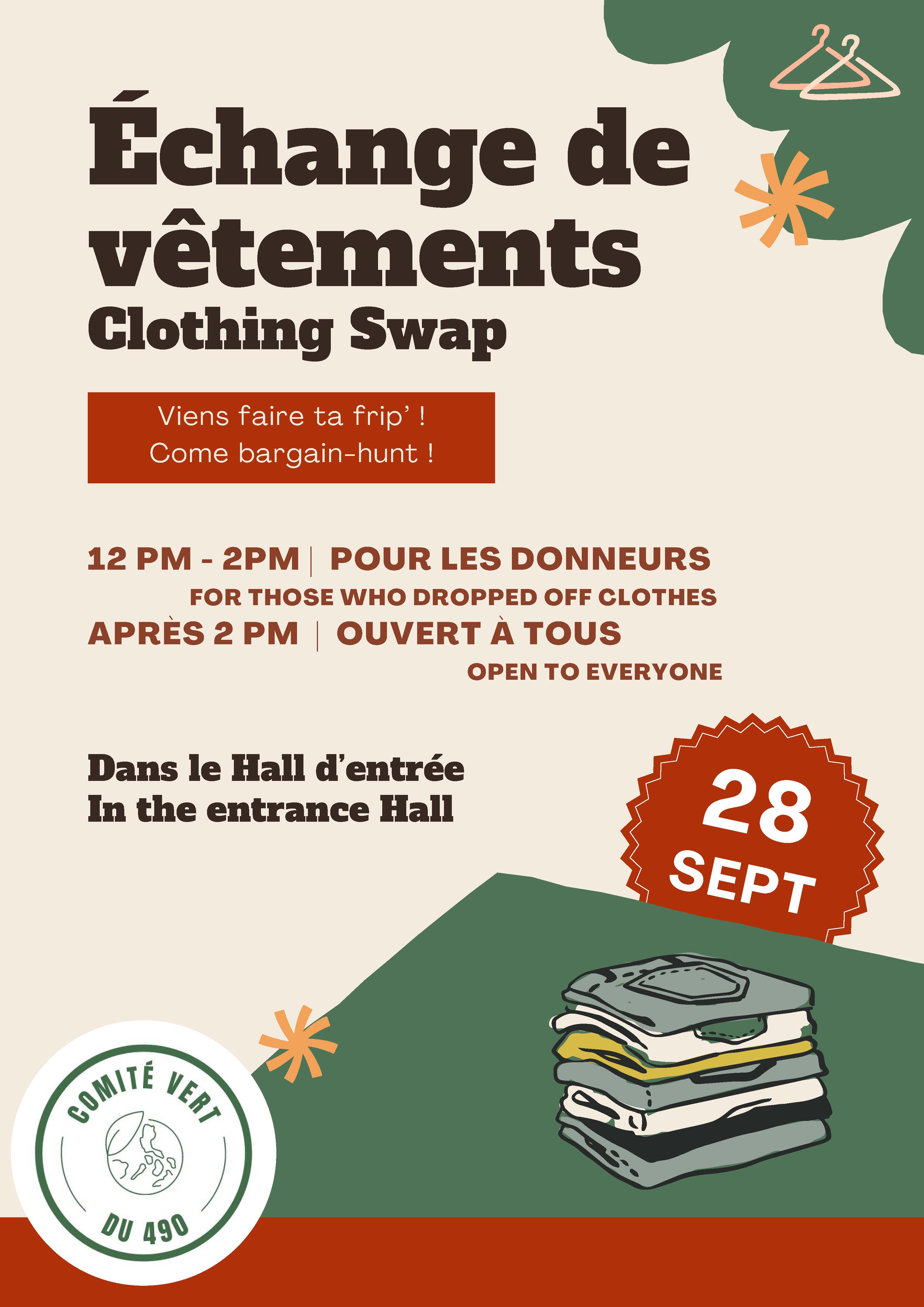 The clothing swap will take place in the entrance hall. Those who dropped off clothes will have the first chance to browse from 12 to 2 pm and then the swap will be open to everyone. Any remaining pieces will be used to make the solidarity baskets for newcomers in Québec, and given to the Café Rencontre Centre-Ville on St-Joseph Street.