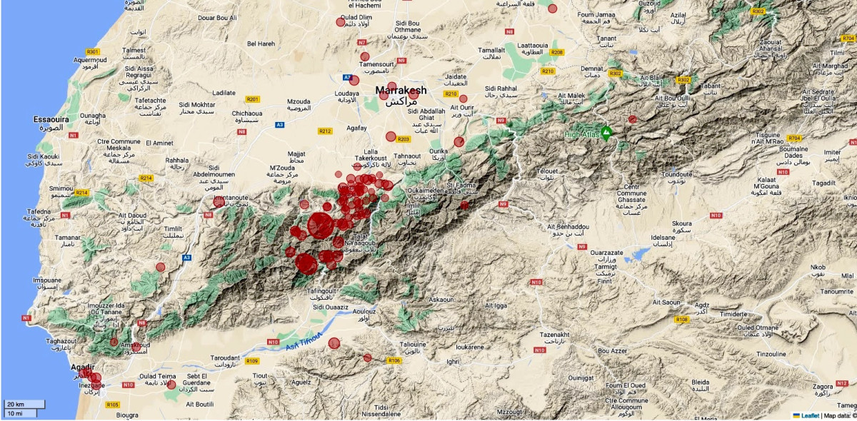 4) Sur le site Web d'Iris, on peut générer une animation similaire des tremblements de terre passés; ce site Web dispose également d'une vue 3D interactive. À ce jour, ce site n'inclut cependant pas les récentes répliques plus petites au Maroc, bien qu'il ait les 3 principaux événements : https://tinyurl.com/568t7nxb
