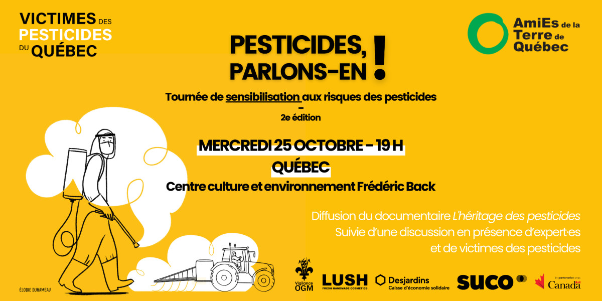 Pour la deuxième édition, Victimes des pesticides du Québec organise une tournée de sensibilisation aux risques des pesticides. Grâce au soutien des AmiEs de la Terre de Québec, Victimes des pesticides du Québec se déplacera à Québec le mercredi 25 octobre au Centre culture et environnement Frédéric Back.