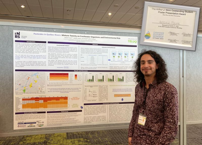 Antoine Faure, étudiant au doctorat, qui présentait une affiche intitulée "Pesticides in Quebec rivers: Mixture toxicity in freshwater organisms and envrionmental risks", a obtenu le prix de la 3e meilleure affiche (photo ci-dessous, source : LinkedIn Antoine Faure).