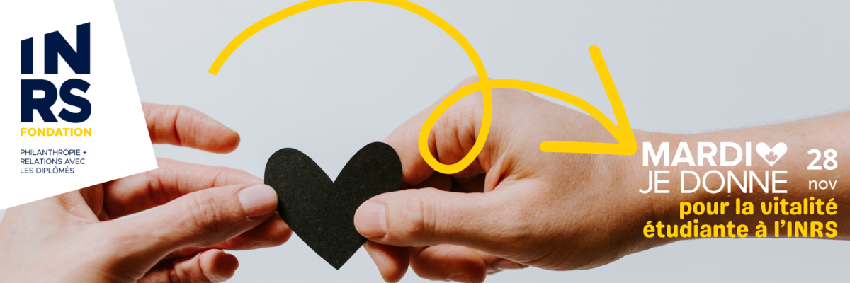 Le 28 novembre prochain, la Fondation de l'INRS mobilisera sa communauté pour participer au mouvement mondial de solidarité #mardijedonne, afin de soutenir la vitalité étudiante à l'Institut national de la recherche scientifique. Notre objectif est de soutenir un environnement dynamique, enrichissant et propice à l’épanouissement de notre communauté étudiante.
