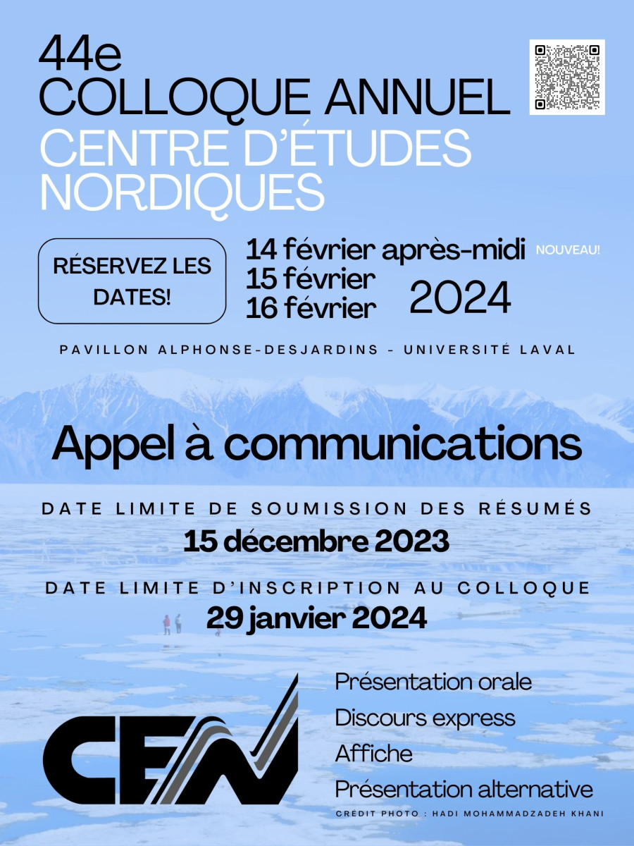 Le 44e colloque annuel du Centre d'études nordiques (CEN) se tiendra les 14, 15 et 16 février 2024 au pavillon Alphonse-Desjardins de l'Université Laval.