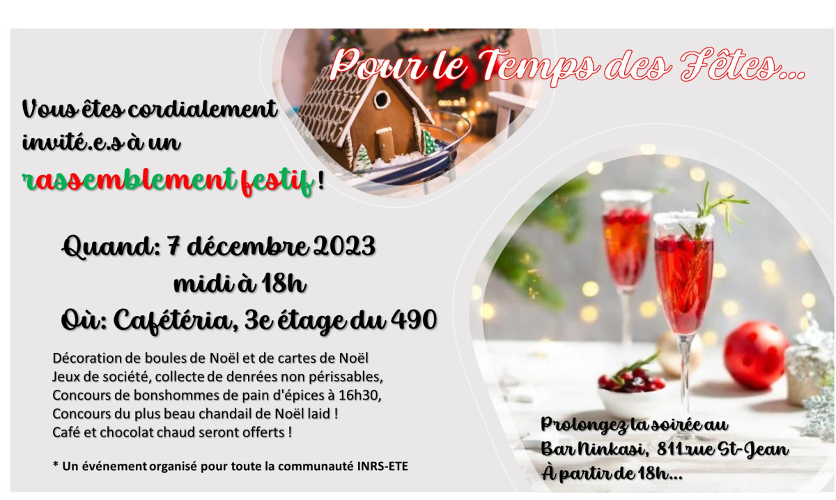 For the holiday season, the entire INRS community is invited to a festive gathering organized jointly by the AECETE and ETE Centre.
