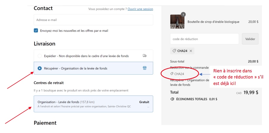 Si vous commandez en ligne : ne pas oublier d’inscrire le nom de l’enfant dans la section adresse de facturation (Flavien De Coninck) et le code CHA24 dans code de réduction s’il n’y figure pas déjà, puis valider (voir procédure en image).