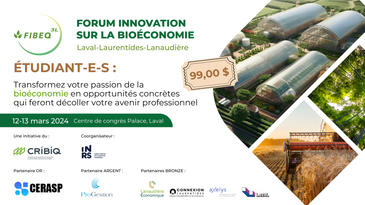 Le CRIBIQ et l'Institut national de la recherche scientifique (INRS) vous invitent au Forum Innovation sur la Bioéconomie de Laval-Laurentides-Lanaudière (FIBEQ 3L). Cet événement mettra en lumière les filières porteuses de la bioéconomie des régions de Laval, des Laurentides et de Lanaudière, soulignant l'importance de l'innovation et de la collaboration régionale des acteurs de ce secteur en plein essor.
