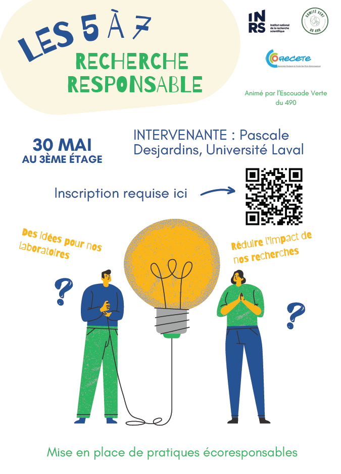 L'intervenante du 5 à 7 est Pascale Desjardins de l'Université Laval. Elle viendra présenter le developpement des initiatives de recherche responsable au sein des laboratoires de l'ULaval.