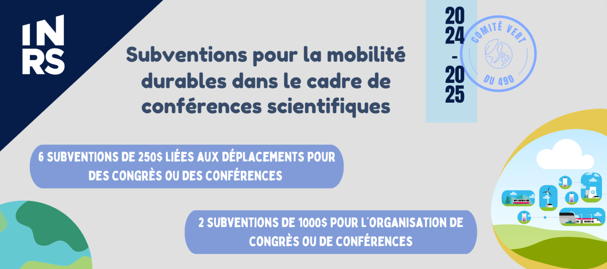 Afin de sensibiliser les membres de la communauté INRS du Centre ETE à choisir des modes de transport plus respectueux de l'environnement, le Comité Vert du 490 est fier de vous offrir différentes subventions pour vos déplacements écoresponsables. Cette initiative est notamment financée par les "Initiatives de développement durable 2024".