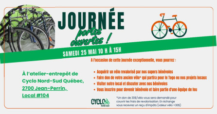 Le Comité Cyclo Nord-Sud de Québec, une organisation bénévole dévouée à rendre le vélo accessible à toutes et tous, annonce sa journée portes ouvertes qui se tiendra le samedi 25 mai de 10h à 15h au 2700 Rue Jean-Perrin Local 104.