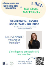 Les équipes des séminaires en science des données et des 5 à 7 recherche responsable s’allient pour vous offrir un séminaire et lunch sur l’intelligence artificielle (IA) responsable le vendredi 24 janvier 2025 de 12h à 13h30 au local 2422 de Centre ETE de l’INRS.