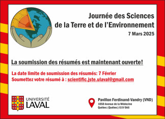Université Laval is pleased to invite you the 23rd edition of the Journée des Sciences de la Terre et de l’Environnement (JSTE). The JSTE is an annual conference organized alternately by Université Laval and INRS in Québec City. This year, we are thrilled to extend our invitation to include other universities across the Province of Québec.