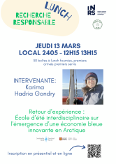 Pour la 6e édition du Lunch Recherche responsable, nous vous invitons le jeudi 13 mars de 12h15 à 13h15 en salle 2405 pour le retour de Karima Hadria Gondry, étudiante à la maîtrise en sciences de l'eau, sur sa participation à l'école d'été sur l'émergence d'une économie bleue innovante en Arctique. Cette formation est organisée par Sentinelle Nord et par le Partenariat circumpolaire WAGE de l'Université Laval. Cette expédition offre une formation expérientielle à des étudiants en sciences de l'eau et en sciences sociales. Karima nous parlera de son expérience du projet et la nécessité de la transdisciplinarité pour l'émergence d'initiatives et de stratégies collaboratives dans la recherche nordique.