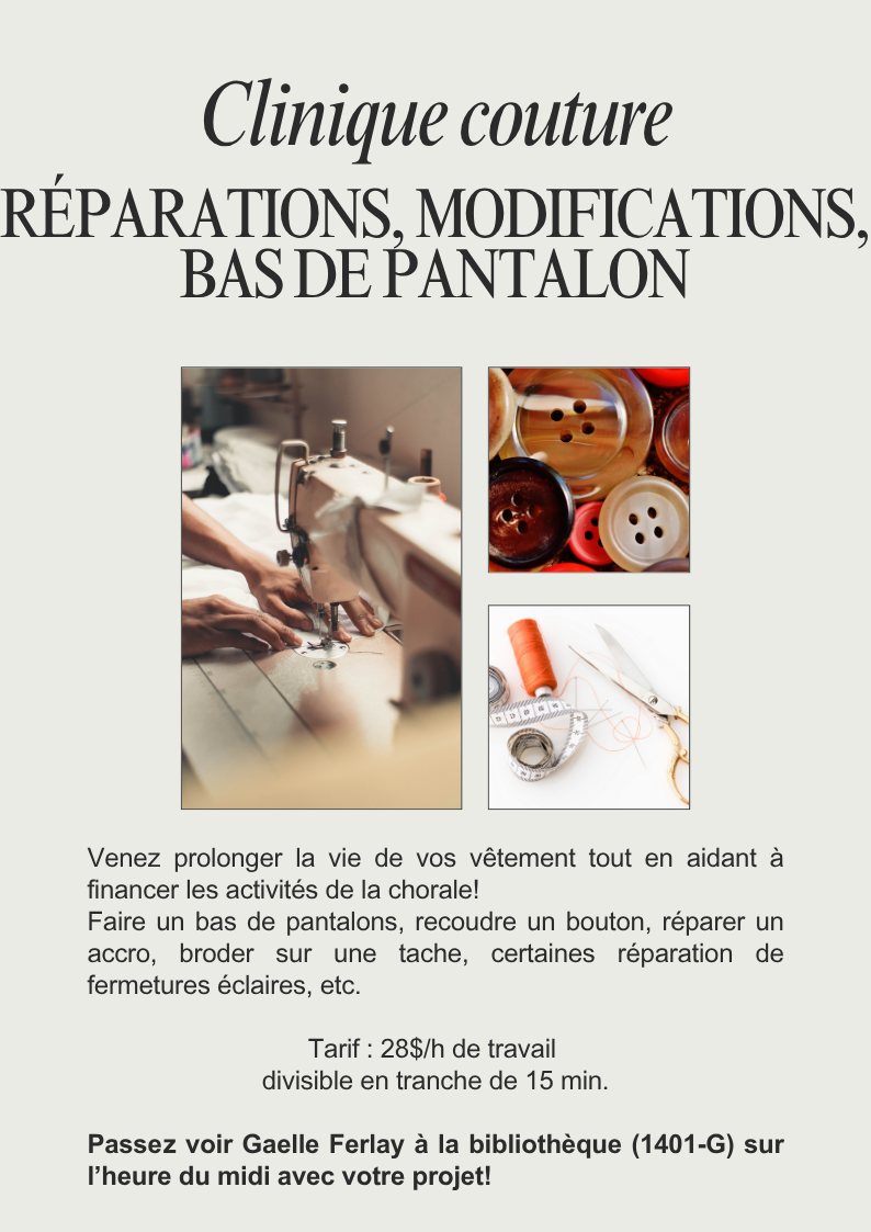 Venez prolonger la vie de vos vêtement tout en aidant à financer les activités de la chorale!