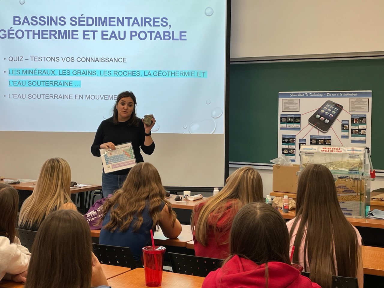 Les chercheuses de la CGC Christine Rivard et Stéphanie Larmagnat (2e photo ci-dessous), accompagnées de Manon Sayag, doctorante à l’INRS dans l'équipe de Geneviève Bordeleau, ont présenté les multiples facettes des carrières en géosciences et partagé leurs parcours inspirants. Elles ont aussi animé deux ateliers interactifs sur l’utilisation des minéraux dans la vie de tous les jours, les roches sédimentaires, la géothermie et l’eau souterraine.