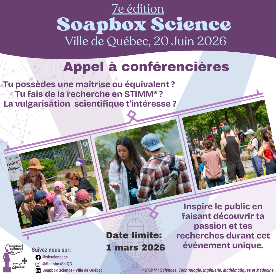 Pour en savoir plus sur Soapbox Science, visitez : / To learn more about Soapbox Science visit: http://soapboxscience.org and https://www.soapboxscience-quebec-city.ca